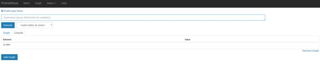 通过上面的步骤安装好 Prometheus 之后,我们现在可以开始体验 Prometheus 了。Prometheus 提供了可视化的 Web UI 方便我们操作,直接访问 http://localhost:9090/ 即可,它默认会跳转到 Graph 页面: