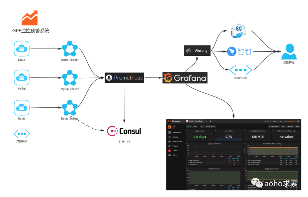 如上图所示,Prometheus 从不同类型的 Exporter 上收集到业务服务或者中间件的数据,然后Grafana 从 Prometheus 中获取数据并进行可视化展示,还会根据报警规则将报警信息通过邮件、钉钉或者短信发送给开发人员。