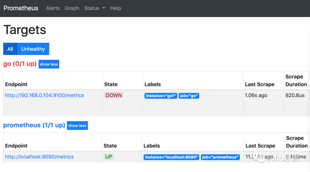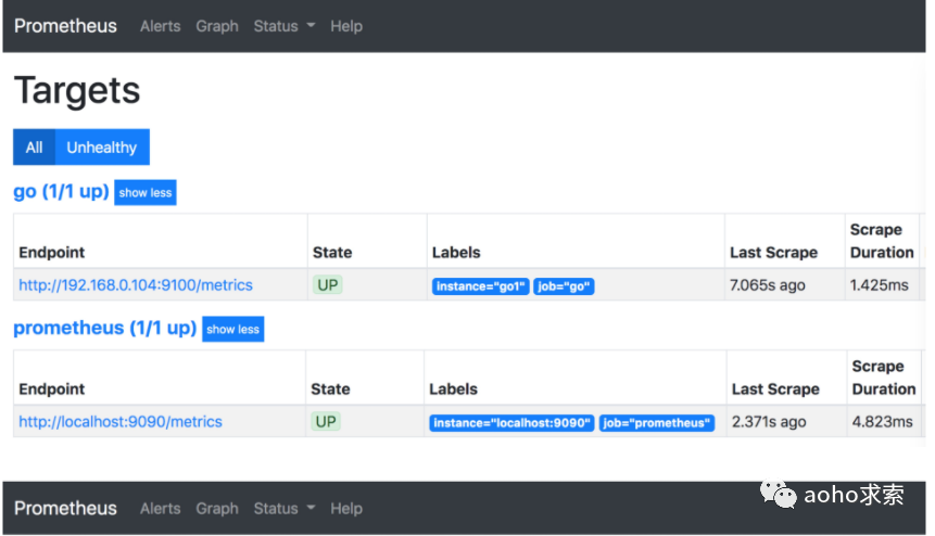 由上图可以看到,Prometheus 自身的数据抓取已经成功,但是对 Go 程序的抓取一直处于失败状态,所以,接下来我们需要部署 Go 服务程序,并提供相应的数据抓取网络接口。