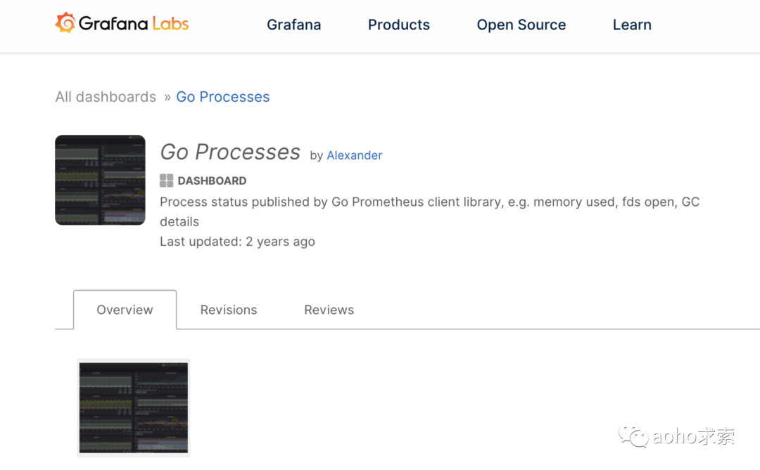 首先,我们在https://grafana.com/grafana/dashboards上搜索 Go 相关的看板配置,然后检查这个看板配置是否和我们所收集数据的Exporter 相互吻合,确定之后,复制该看板详情页面的网络URL。