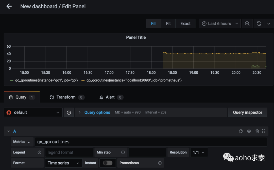 新建看板时,只要在 Metrics 中输入自己想要监控的数据名称即可,比如我们想要监控 Go 程序中协程的数量,则输入 go_goroutines,然后上方图标就会显示出对应的数据,一个是Prometheus 平台自身的协程数据,另外一个则是 Go 程序的协程数据。如果只想看 Go 程序的,则可以输入go_goroutines{job="go"},即可限定只显示 Go 程序的数据。