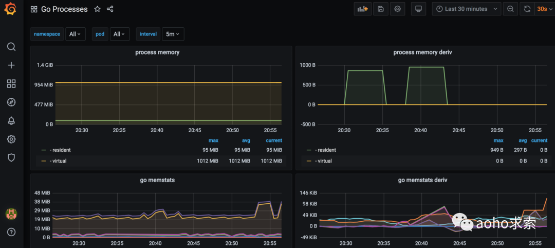 从可视化看板中,我们可以清晰地看到 Go 程序相关的性能指标曲线图,比如 process memory、 go memstats、Goroutines 和 GC duration等。