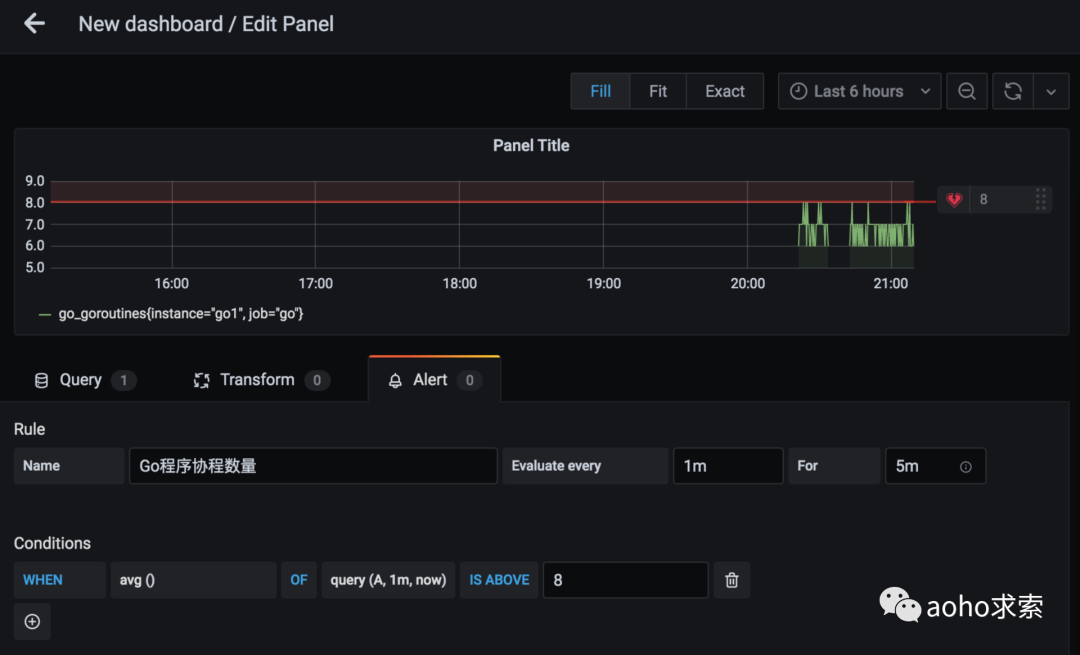 首先,我们编辑想要报警指标的看板,切换到 Alert 一栏,在 Conditions 下面我们可以进行均值相关的配置,如下图所示,我们就做了这样的配置:如果 Go 程序线程数量在一分钟内的均值超过8 则报警,对应的上方图标就有一条红线,表示警戒线。