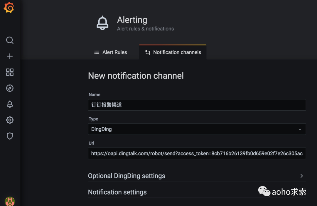 添加后,我们可以获得该机器人的 Webhook 地址,然后进入 Grafana 的报警渠道配置页面:新建 DingDing 类型的报警渠道,将 Webhook 地址填入 Url 一栏,点击 Test 没问题后再点击 Save 进行保存。