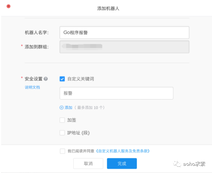 接着,我们需要配置报警渠道,可以选择钉钉或者邮件渠道。我们在需要发送报警消息的群中首先添加一个自定义机器人,安全设置就勾选“自定义关键词”选项,关键词就选择“报警”二字。