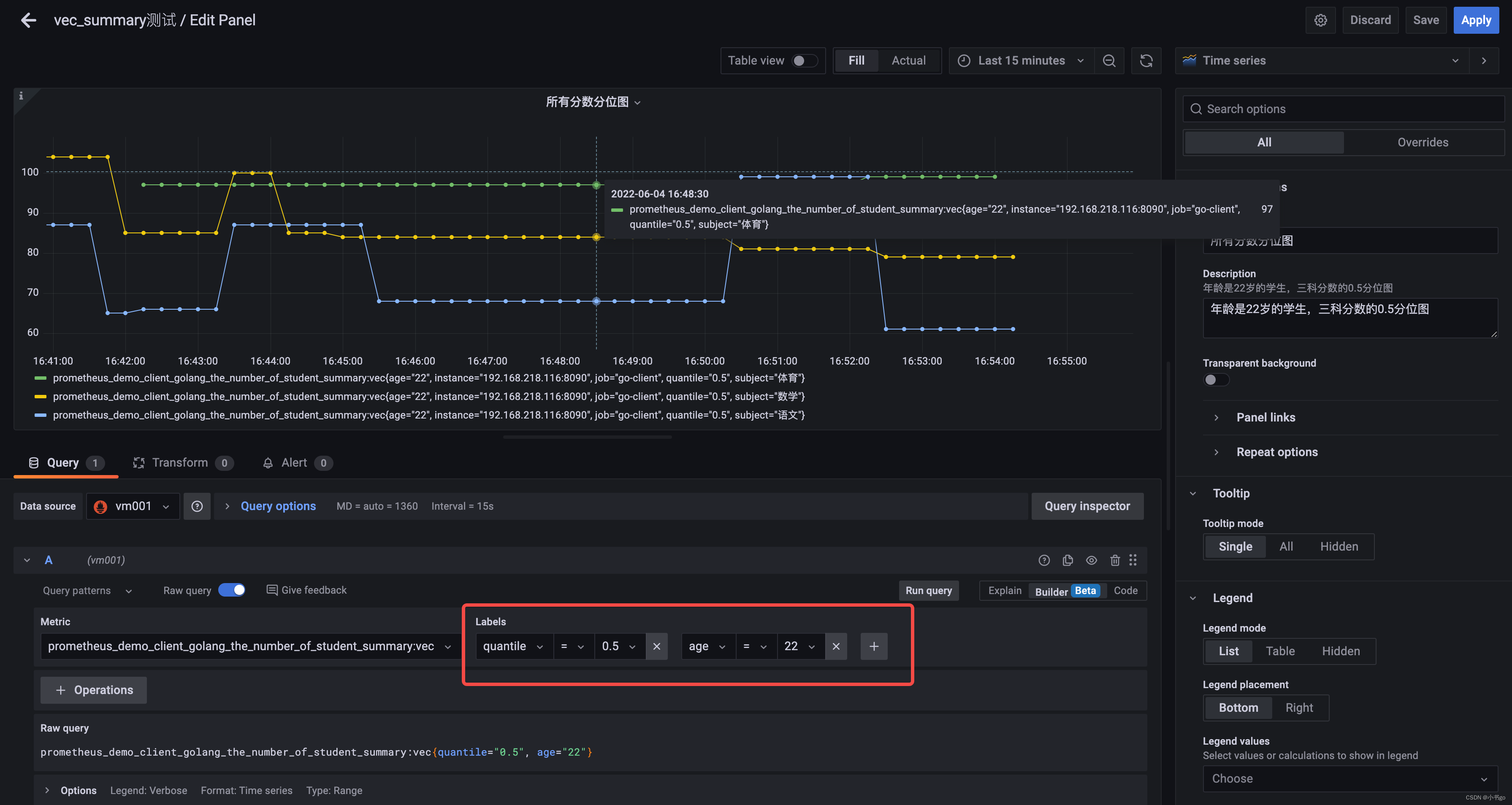 以上就是鳗鱼万宝路最近收集整理的关于go-prometheus业务监控指标实战(二)案例 Histogram 统计班级人数的考试分数(value),每个人有subject(学科)和age(年龄)两个属性(label)案例 Summary 统计班级人数的考试分数(value),每个人有subject(学科)和age(年龄)两个属性(label)的全部内容,更多相关go-prometheus业务监控指标实战(二)案例内容请搜索靠谱客的其他文章。
