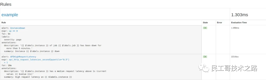 配置好后,需要重启下 Prometheus server,然后访问 http://localhost:9090/rules 可以看到刚刚配置的规则: