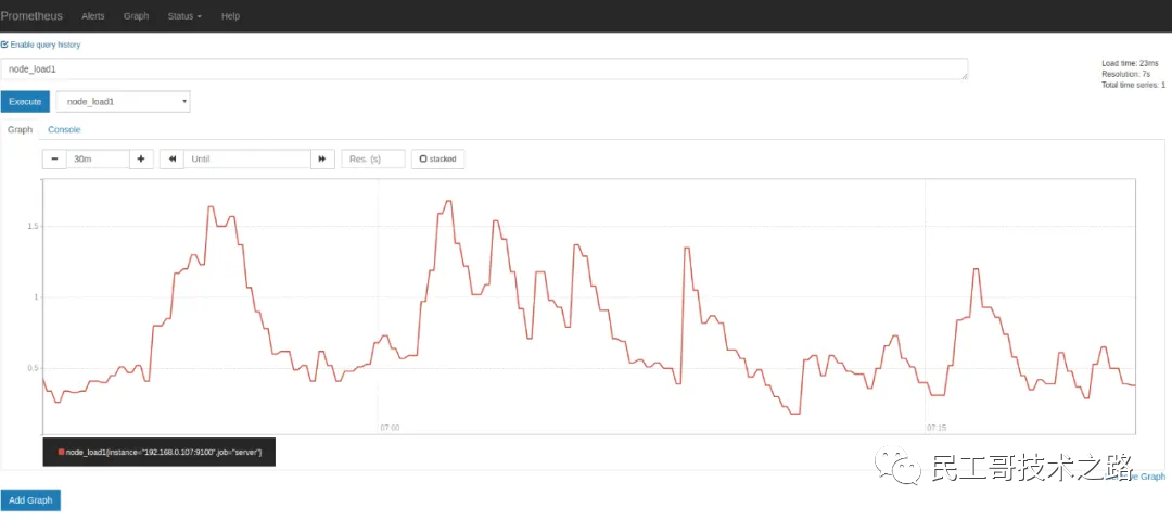上面在介绍 Prometheus 的配置文件时,可以看到 scrape_interval 参数是 15s,也就是说 Prometheus 每 15s 访问一次 /metrics 页面,所以我们过 15s 刷新下页面,可以看到指标值会自增。在 Graph 标签中可以看得更明显: