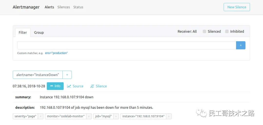 这个时候再访问 Alertmanager,可以看到 Alertmanager 已经接收到告警了: