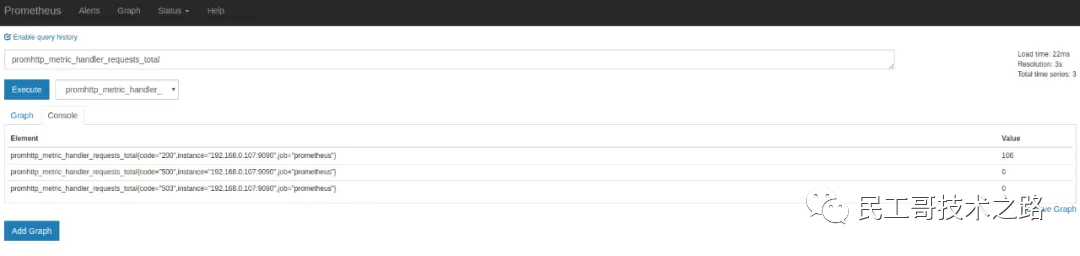 promhttp_metric_handler_requests_total{code="200",instance="192.168.0.107:9090",job="prometheus"} 106