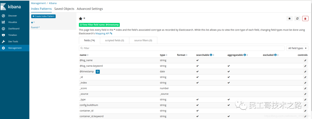最后,还可以将日志统一整合至Kinbana界面显示,这个和之前的ELK操作没有区别,创建 fluentd-* 索引。