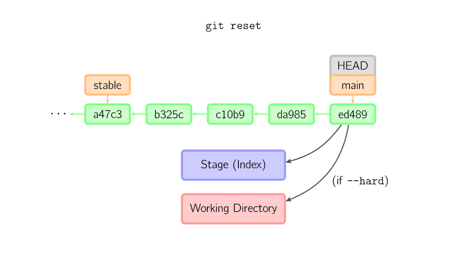 如果没有给出提交点的版本号,那么默认用HEAD。这样,分支指向不变,但是索引会回滚到最后一次提交,如果用--hard选项,工作目录也同样。