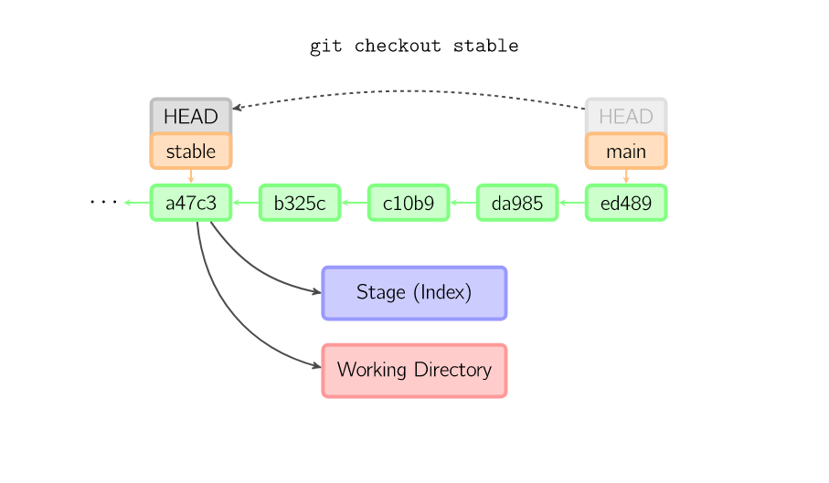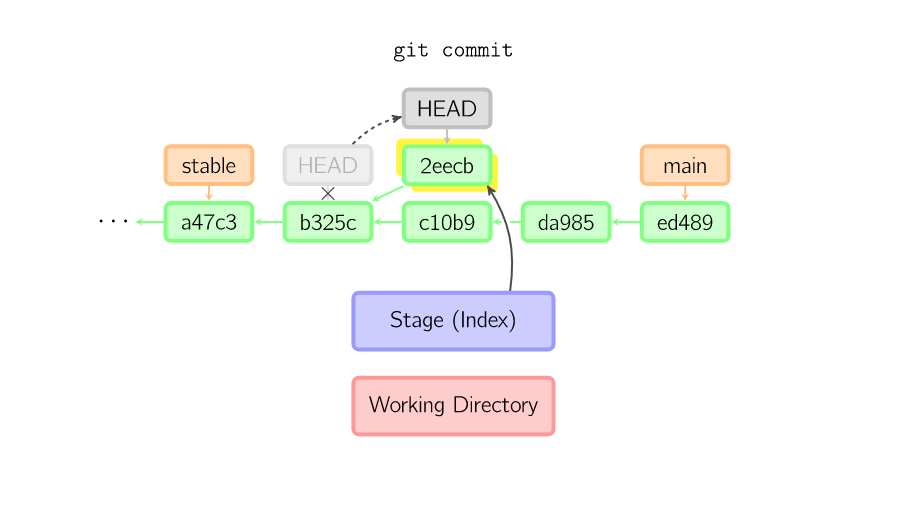 绿色的5位字符表示提交的ID,分别指向父节点。分支用橘色显示,分别指向特定的提交。当前分支由附在其上的HEAD标识。这张图片里显示最后5次提交,ed489是最新提交。main分支指向此次提交,另一个stable分支指向祖父提交节点。