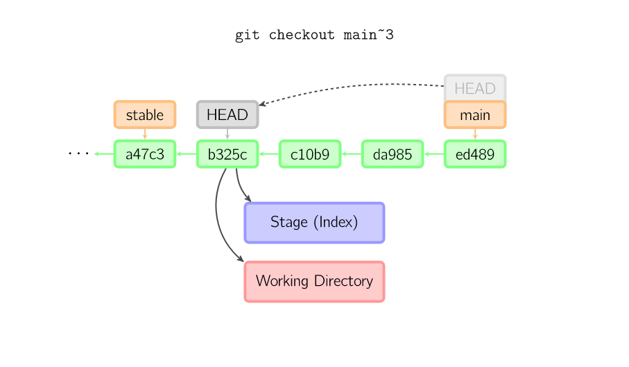 如果既没有指定文件名,也没有指定分支名,而是一个标签、远程分支、SHA-1值或者是像main~3类似的东西,就得到一个匿名分支,称作detached HEAD(被分离的HEAD标识)。这样可以很方便地在历史版本之间互相切换。比如说你想要编译1.6.6.1版本的git,你可以运行git checkout v1.6.6.1(这是一个标签,而非分支名),编译,安装,然后切换回另一个分支,比如说git checkout main。然而,当提交操作涉及到“分离的HEAD”时,其行为会略有不同,详情见在下面。