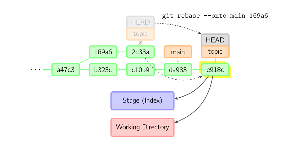 要限制回滚范围,使用--onto选项。下面的命令在main分支上重演当前分支从169a6以来的最近几个提交,即2c33a。