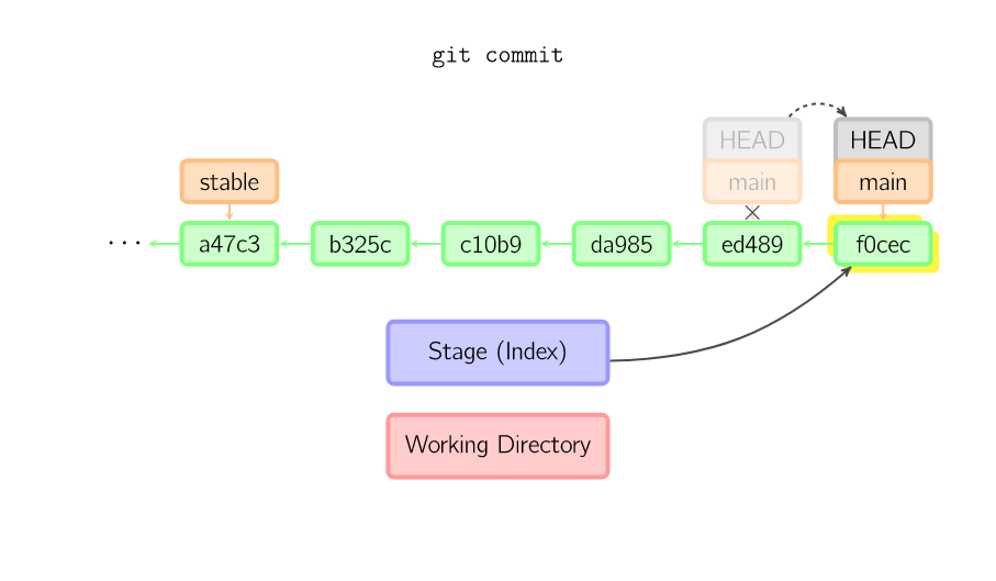 提交时,git用暂存区域的文件创建一个新的提交,并把此时的节点设为父节点。然后把当前分支指向新的提交节点。下图中,当前分支是main。在运行命令之前,main指向ed489,提交后,main指向新的节点f0cec并以ed489作为父节点。