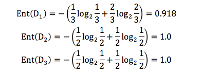 因为 D1 有 3 个记录,D2 有 2 个记录,D3 有2 个记录,所以 D 中的记录一共是 3+2+2=7,即总数为 7。所以 D1 在 D(父节点)中的概率是 3/7,D2在父节点的概率是 2/7,D3 在父节点的概率是 2/7。那么作为子节点的归一化信息熵 = 3/7*0.918+2/7*1.0=0.965。