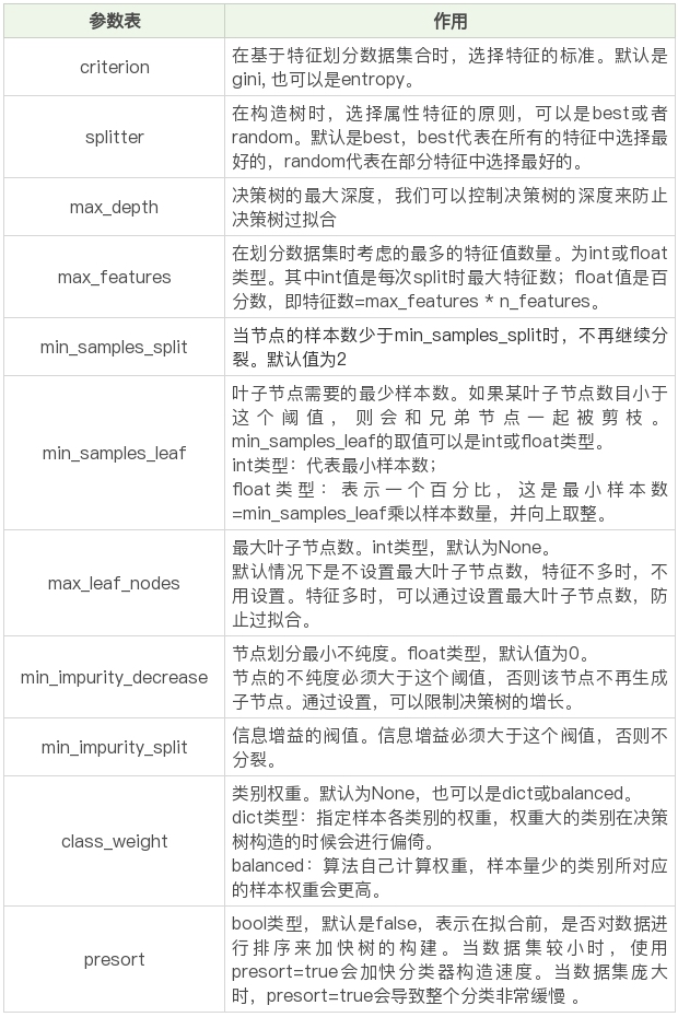 # 一般建议使用默认的参数,默认参数不会限制决策树的最大深度,不限制叶子节点数,认为所有分类的权重都相等等。