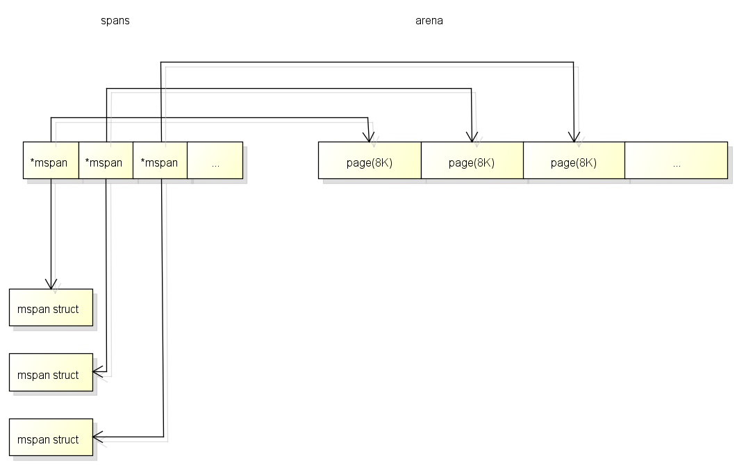 spans区域中一个指针(8 byte)对应了arena区域中的一页(在go中一页=8KB).