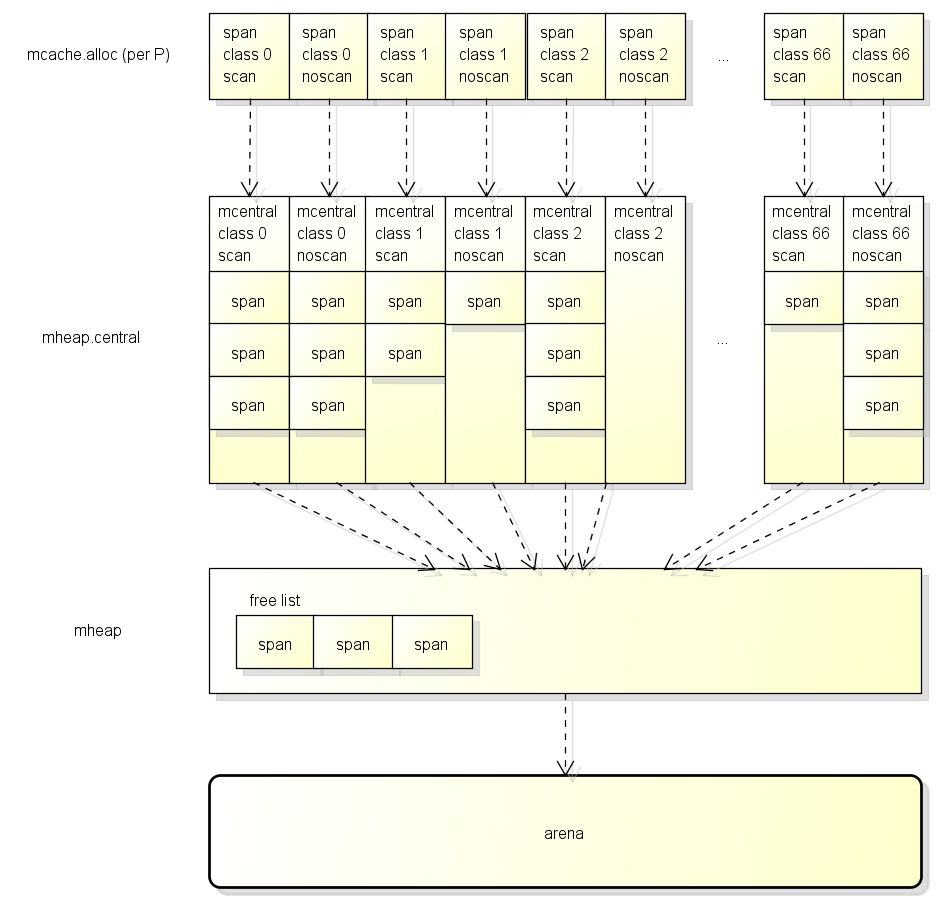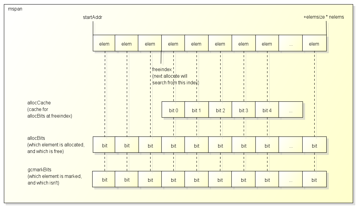 需要注意的是span结构本身的内存是从系统分配的, 上面提到的spans区域和bitmap区域都只是一个索引.