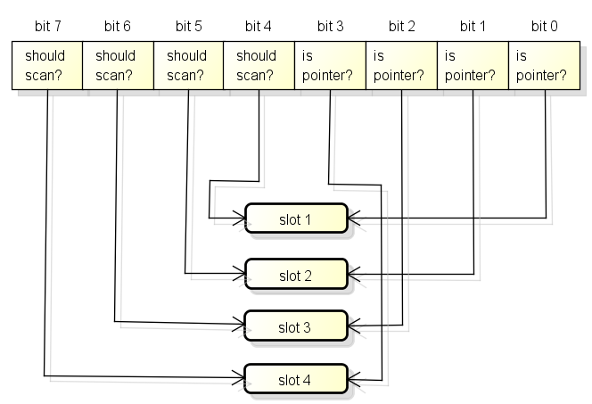 每一个指针大小的内存都会有两个bit分别表示是否应该继续扫描和是否包含指针: