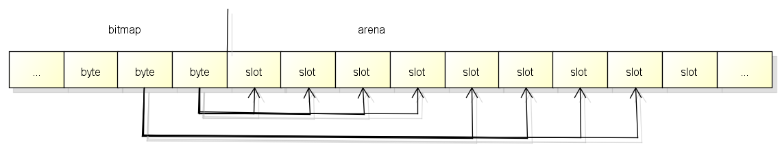 spans区域的一个指针对应arena区域的一页的结构如下, 和bitmap不一样的是对应关系会从开头开始: