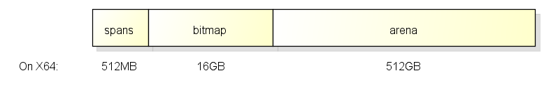 go在程序启动时会分配一块虚拟内存地址是连续的内存, 结构如下: