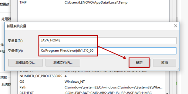 在弹出的窗口中输入变量名:JAVA_HOME和变量值:C:/Program Files/Java/jdk1.7.0_60 。然后选择“确定”
