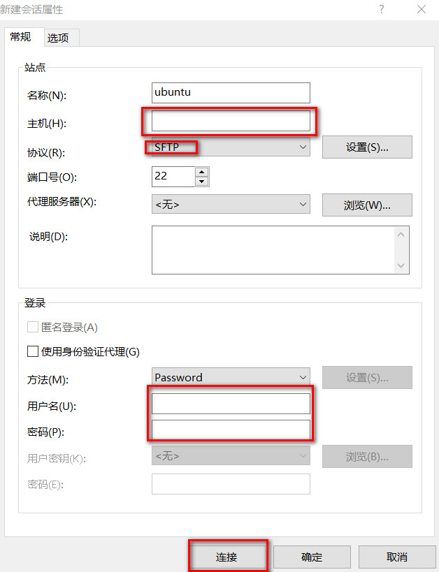 4. 打开Xftp,新建一个ubuntu会话,根据提示输入名称、主机(ubuntu终端查看的ip)、用户名和密码,然后点击连接,根据提示完成创建