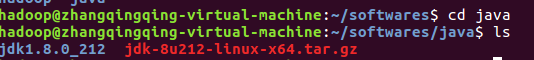 $ mv jdk-8u212-linux-x64.tar.gz /home/hadoop/softwares/java #移动jdk到相应的文件夹,不需要移动的可忽略