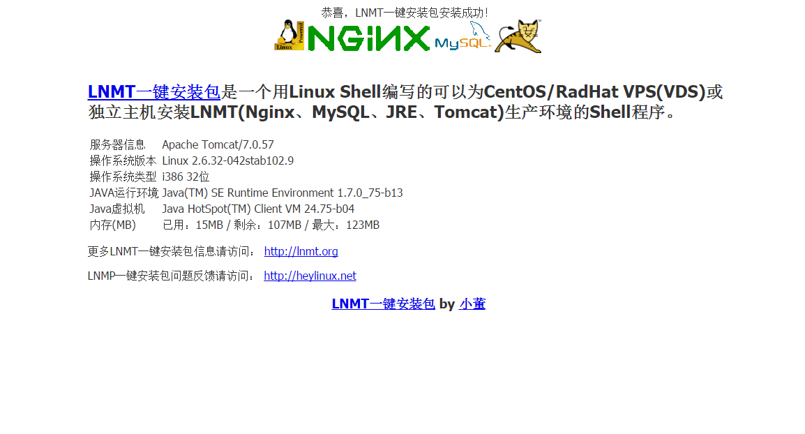 LNMT一键安装包是一个用Linux Shell编写的可以为CentOS/RedHat VPS(VDS)或独立主机安装LNMT(Nginx、MySQL、JRE、Tomcat)生产环境的Shell程序。同时提供一些实用的辅助脚本如:可 以帮助完成Nginx、MySQL/MariaDB、Tomcat的升级、常用缓存组件的安装、重置MySQL root密码、日志切割等许多实用脚本。