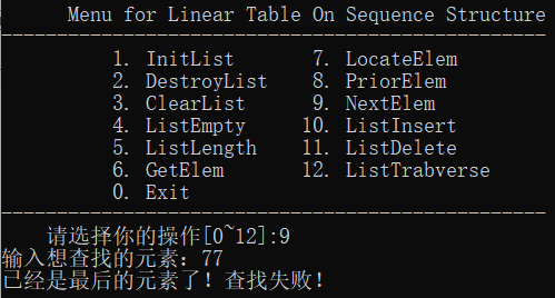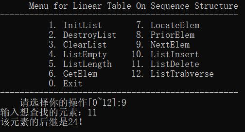 - NextElem:获得后继。输入一个元素,遍历全表,如果找到该元素且位置不在表尾,将该元素的后继元素赋值给 next_e,并返回 OK;否则返回 ERROR;