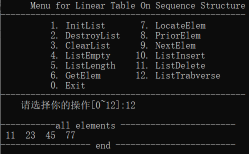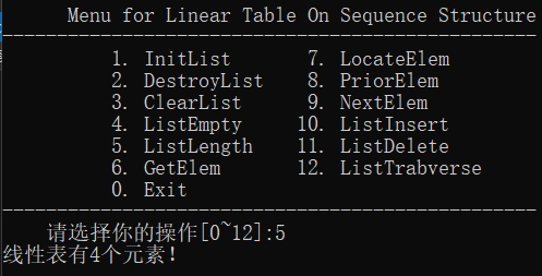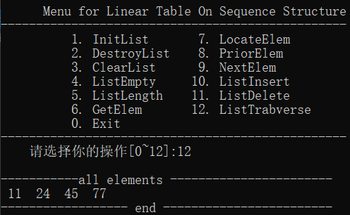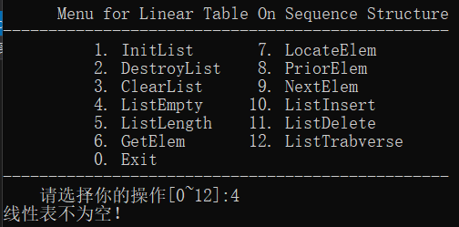 - ListEmpty:判断表是否为空,判断表长是否为 0;为验证该功能,调用后面函数;
