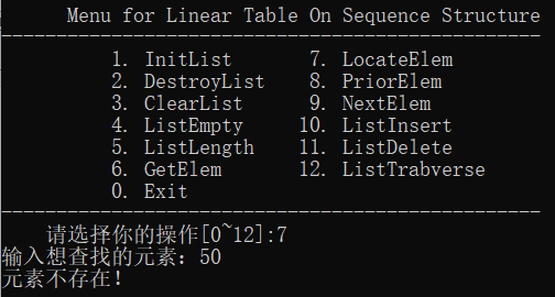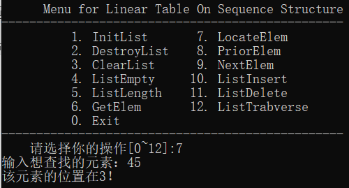 - LocateElem:定位元素。输入一个元素,遍历全表,如果表内有与之满足 Compare()关系的元素则把元素的位置赋值给 e,返回 e 的值;否则返回 ERROR;