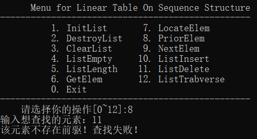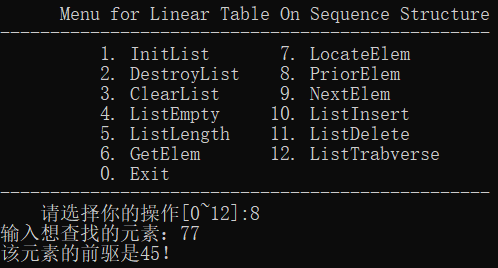 - PriorElem:获得前驱。输入一个元素,遍历全表,如果找到该元素且位置不在表头,将该元素的前驱元素赋值给 pre_e,并返回 OK;否则返回 ERROR;