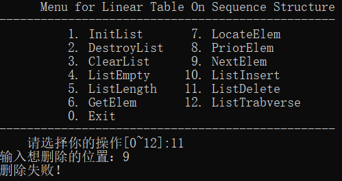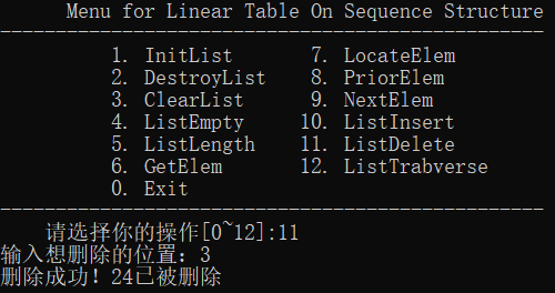 ListDelete:删除元素。输入删除位置,如果该位置数不小于 1 且在表长范围内,则删除该元素,并将该位置后的数逐个前移一位次;表长减 1 并将删除元素值赋给 e,返回 e 的值;否则返回 ERROR;