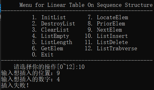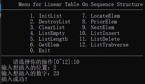 ListInsert:插入元素。输入插入位置、插入元素的值,如果表内空间不足则开辟新空间;如果该位置数不小于 1 且在表长范围内,则将该位置后的数逐个后移一位次,在空出的位置插入元素,表长加 1 并返回 OK;否则返回 ERROR;