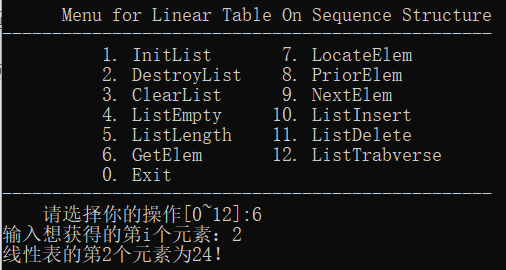GetElem:获取元素位置。输入一个位置数,如果该位置数不小于 1 且在表长范围内,则用 e 返回此位置数据元素的值;否则返回 ERROR;