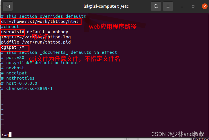8.拷贝thttp源码解压目录下的contrib/redhat-rpm目录下的thttpd.conf文件到系统/etc目录下,并进行如下配置。