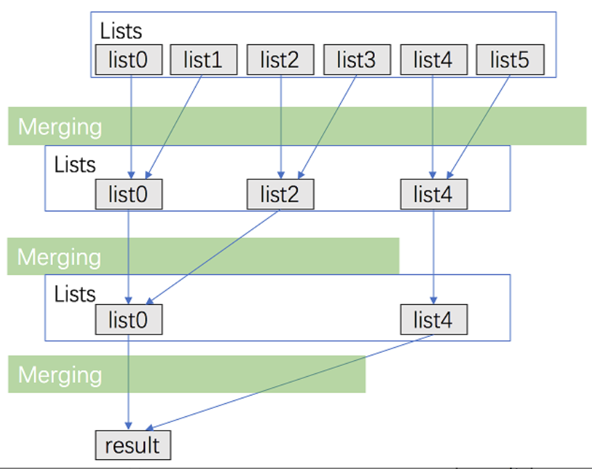 将 k 个链表配对并将同一对中的链表合并;第一轮合并以后, k个链表被合并成了 k/2