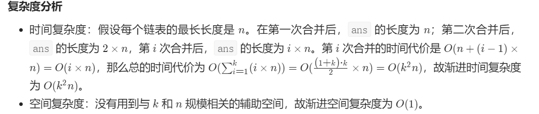 用一个变量 ans 来维护以及合并的链表,第 i次循环把第 i 个链表和 ans 合并,答案保存到 ans 中。