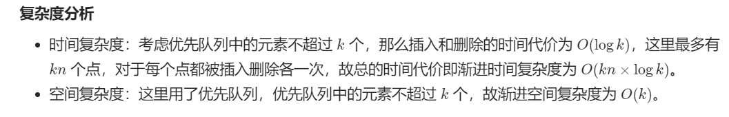 这个方法和前两种方法的思路有所不同,我们需要维护当前每个链表没有被合并的元素的最前面一个,k 个链表就最多有 k 个满足这样条件的元素,每次在这些元素里面选取 val 属性最小的元素合并到答案中。在选取最小元素的时候,我们可以用优先队列来优化这个过程。