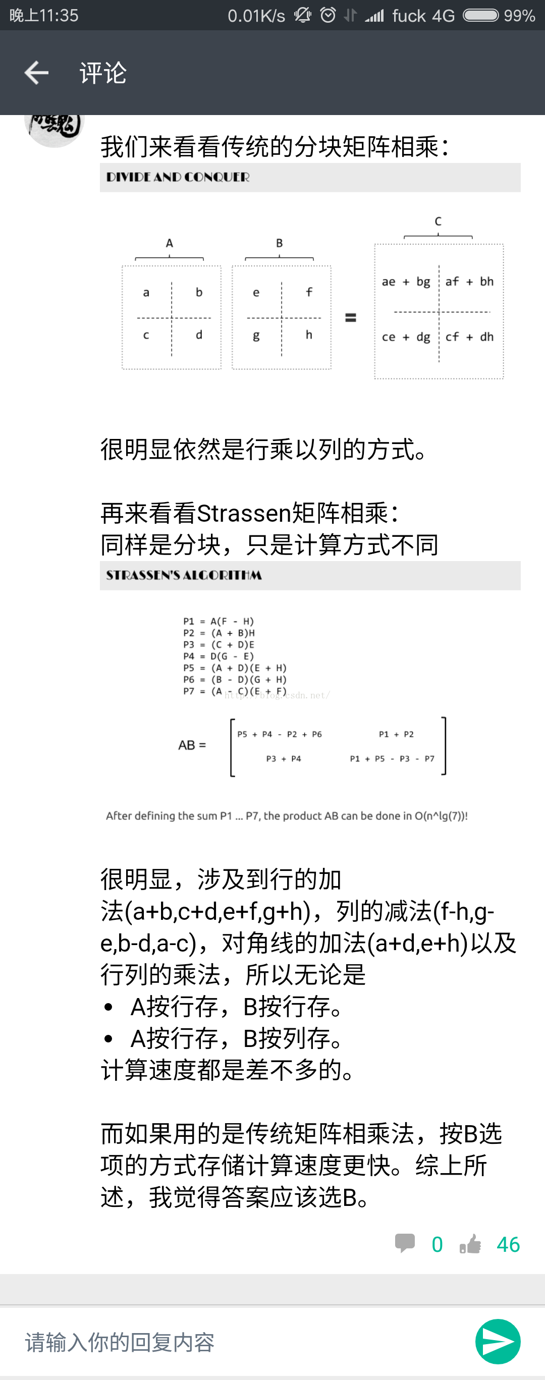 2.(单选题) 有两个N*N的矩阵A和B,想要在PC上按矩阵乘法基本算法编程实现计算A*B。假设N较大,本机内存也很大,可以存下A、B和结果矩阵。那么,为了计算速度,A和B在内存中应该如何存储(按行存指先存储第一行,再第二行,直到最后一行;按列存指先存储第一列,再第二列,直到最后一列)?