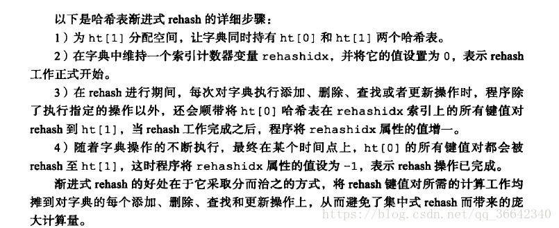 其中渐进式hash能有效解决重新分配hash表带来的服务器停顿问题,不一次性把所有的数据迁移到新的hash表上,而是每次增加,删除,修改后把一个index上的所有数据移动到新hash表中。