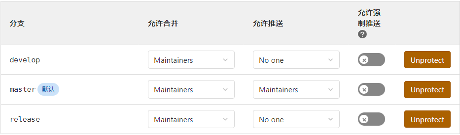 将 master,develop,release 三个分支设置成只允许 maintainers merge,不允许任何人 push,也即杜绝了从本地 merge,push 到远端的情况