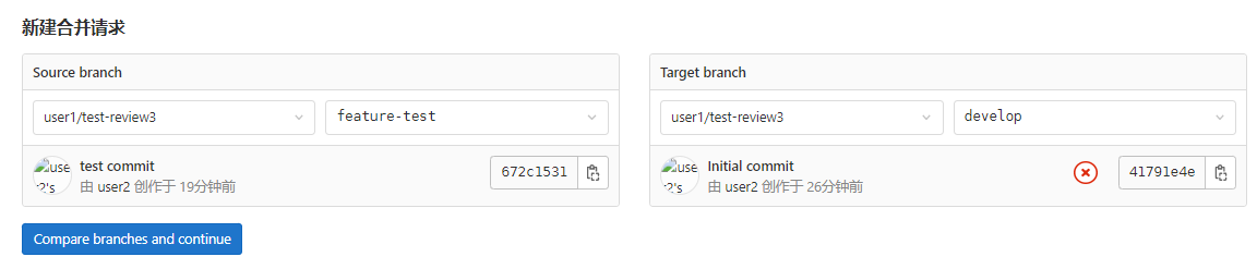 然后点击 【compare branches and continue】,回到合并请求页面。选择 指派人 和 审核者