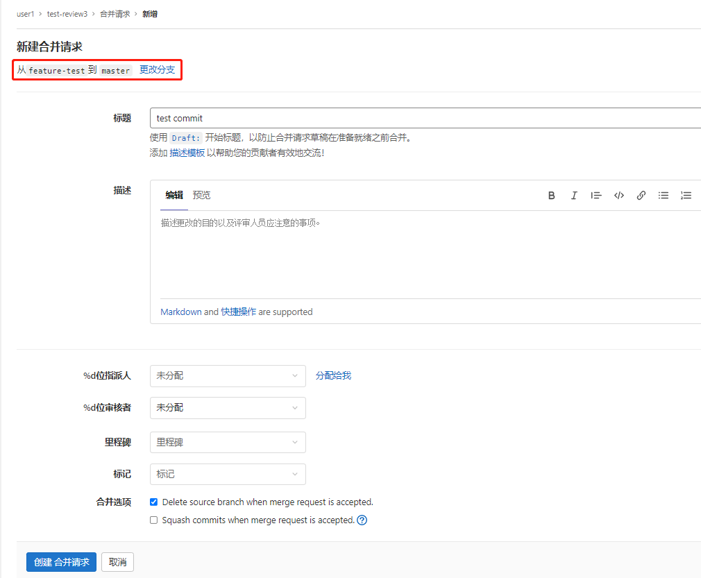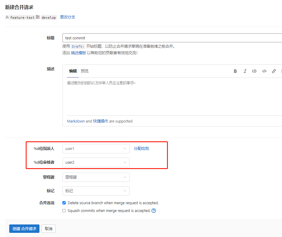 指派人 :选择项目的负责人(maintainer),此人拥有合并请求的权限