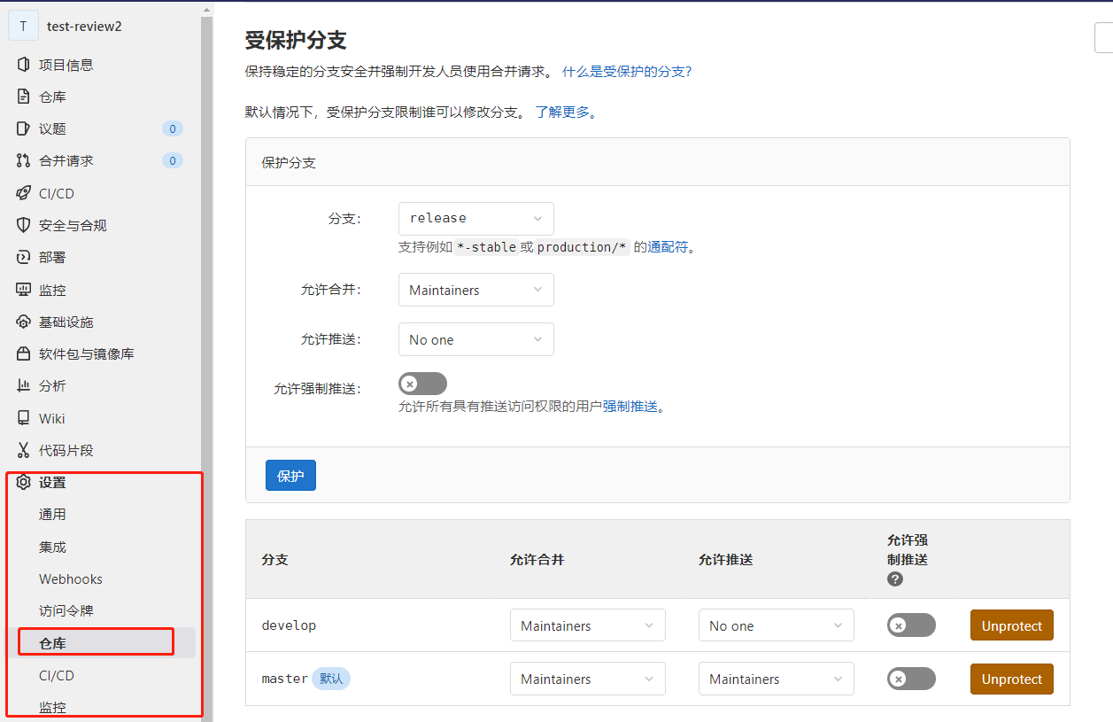 【项目首页 -> Settings -> Repository -> Protected Branches】