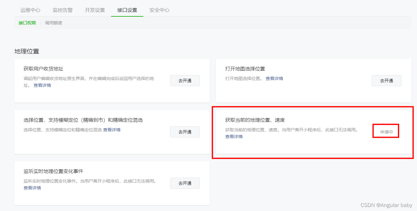 - 再在小程序管理后台,【开发】-【开发管理】-【接口管理】-【接口权限】中申请开通该接口权限: