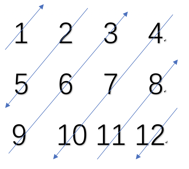 输出:1 2 5 9 6 3 4 7 10 11 8 12